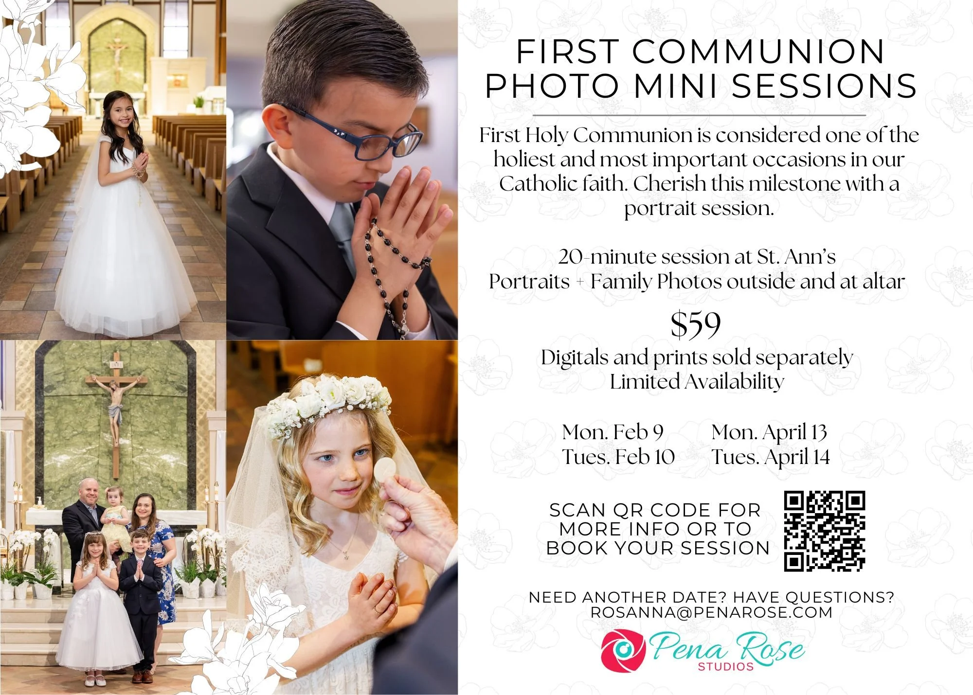 If you can’t attend any of these dates or times, please email Rosanna@PenaRose.com for studio or church availability.